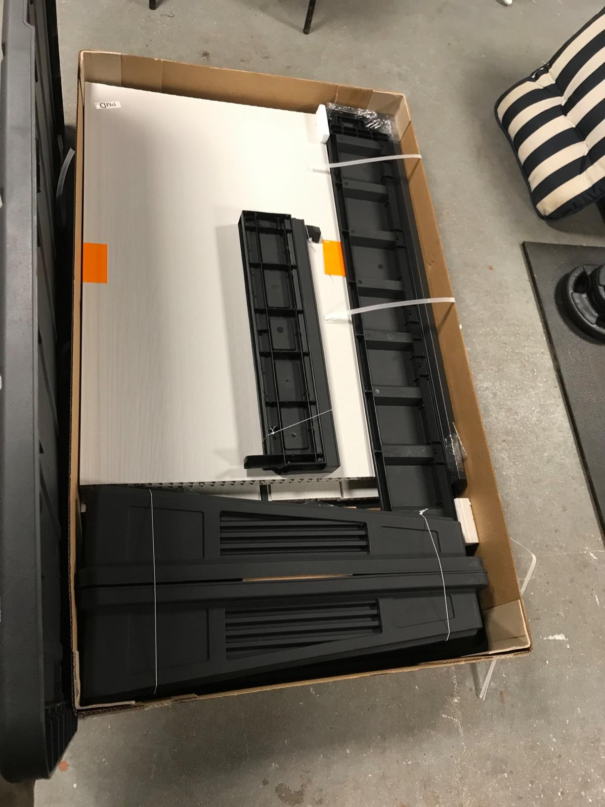 Bring style and functionality into your outdoor living space.1150 L capacity makes it ideal for storing cushions, barbecues, garden equipment, or other items. An easy-open lid with hydraulic pistons, and a bin opening kit makes it perfect for storing two 240 L bins Strong and durable, this storage unit is made with rib-reinforced double walls that are weather-resistant, keeping the shed safe from rot and rust. Adjustable brackets for an extra shelf and lockable doors complete the package.